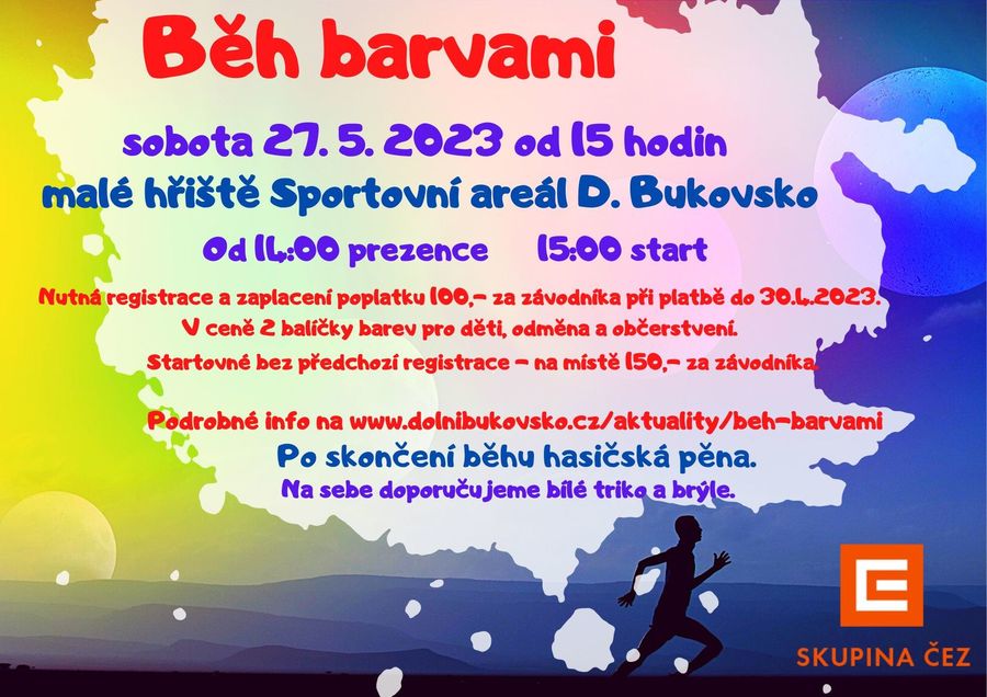 Zveme všechny děti i rodiče na Běh barvami, který odstartuje v sobotu 27. 5. 2023 od 15 hodin. Prezence účastníků probíhá od 14:00 do 14:55. Startovat se bude etapově. Účastníci můžou běžet i jít, pro menší děti je možné vzít odrážedlo. Je možný také start s kočárkem, ale je dobré ho opatřit pláštěnkou. Doporučujeme bílé tričko a brýle. Domácí zvířátka pro jejich bezpečí nechejte doma.
