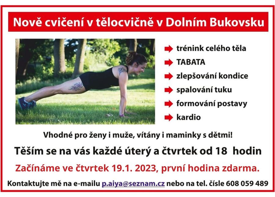 cvičení tabata.jpgV Bukovsku od čtvrtka 19. ledna máte další možnost si zacvičit, tentokrát půjde o dynamičtější cvičení s Klárou. Cvičit se bude pravidelně každé úterý a čtvrtek od 18 hodin.