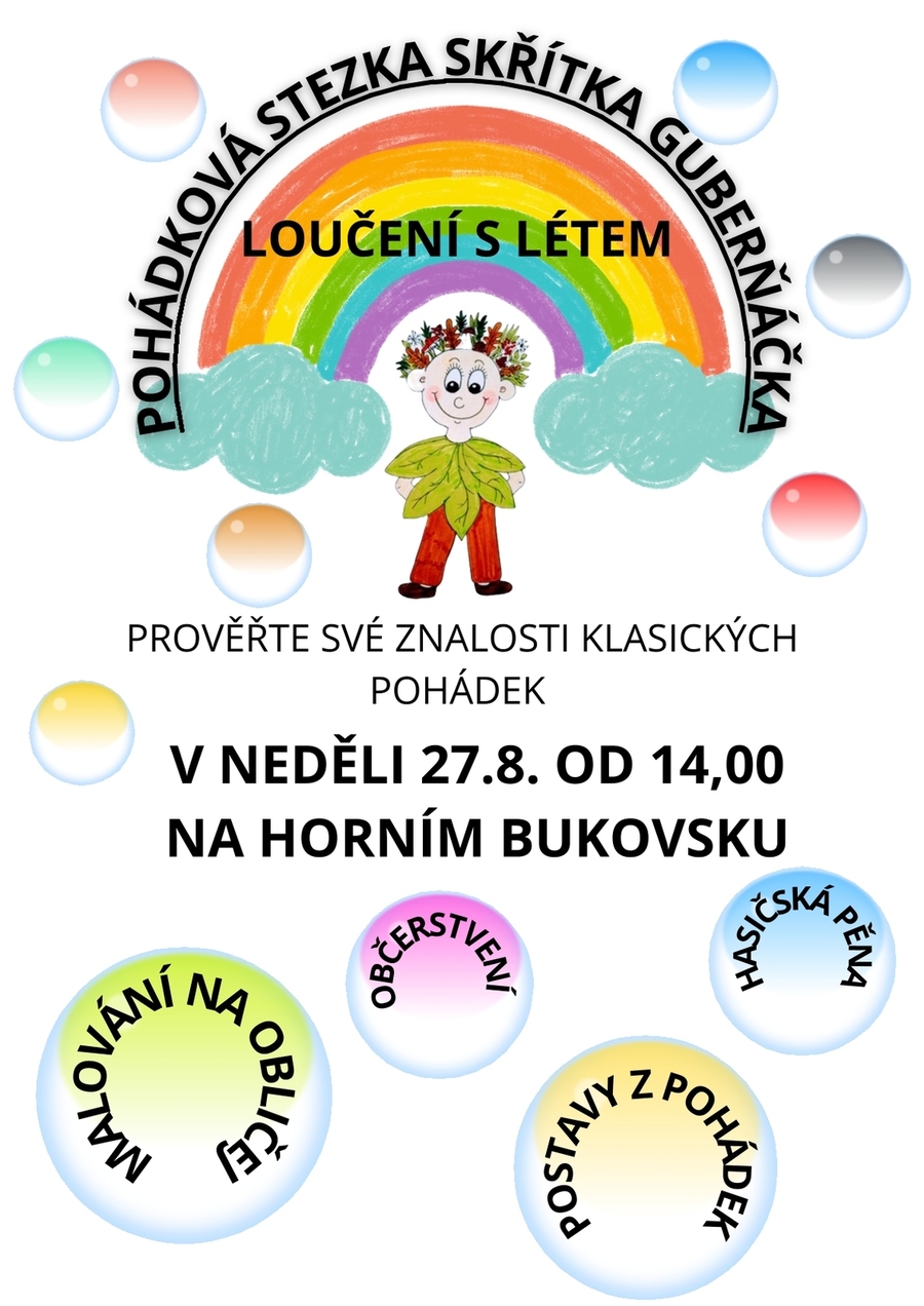 POHÁDKOVÁ STEZKA SKŘÍTKA GUBERŇÁČKA (4) (1).jpgSkřítek Guberňáček si pro vás připravil novou pohádkovou stezku a zve vás v neděli 27. srpna od 14 hodin na zábavné odpoledne. Nebude chybět malování na obličej a hasičská pěna. Náhradní oblečení s sebou!
